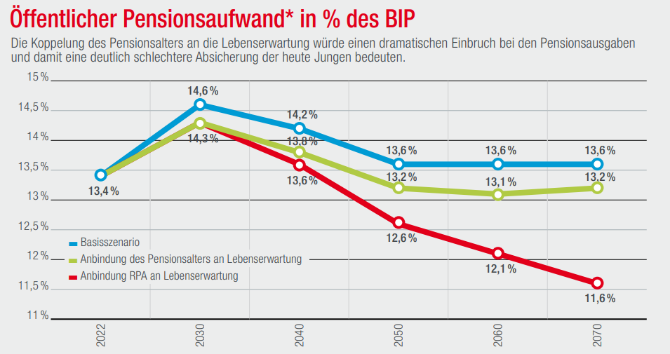 Dem gegenüber wäre eine Koppelung des gesetzlichen Pensionsalters an die Lebenserwartung fatal. Damit würden die Jüngeren, die von den bereits umgesetzten Reformen voll betroffen sind, ein zweites Mal zur Kasse gebeten werden. Das zeigt auch der aktuelle Ageing Report der Europäischen Kommission eindrücklich: Die relativen Ausgaben würden bis 2070 nur mehr rund 12 % des BIP betragen und damit deutlich unter dem Niveau der letzten Jahre liegen, und das bei einem massiven Anstieg der Zahl der dann Älteren!